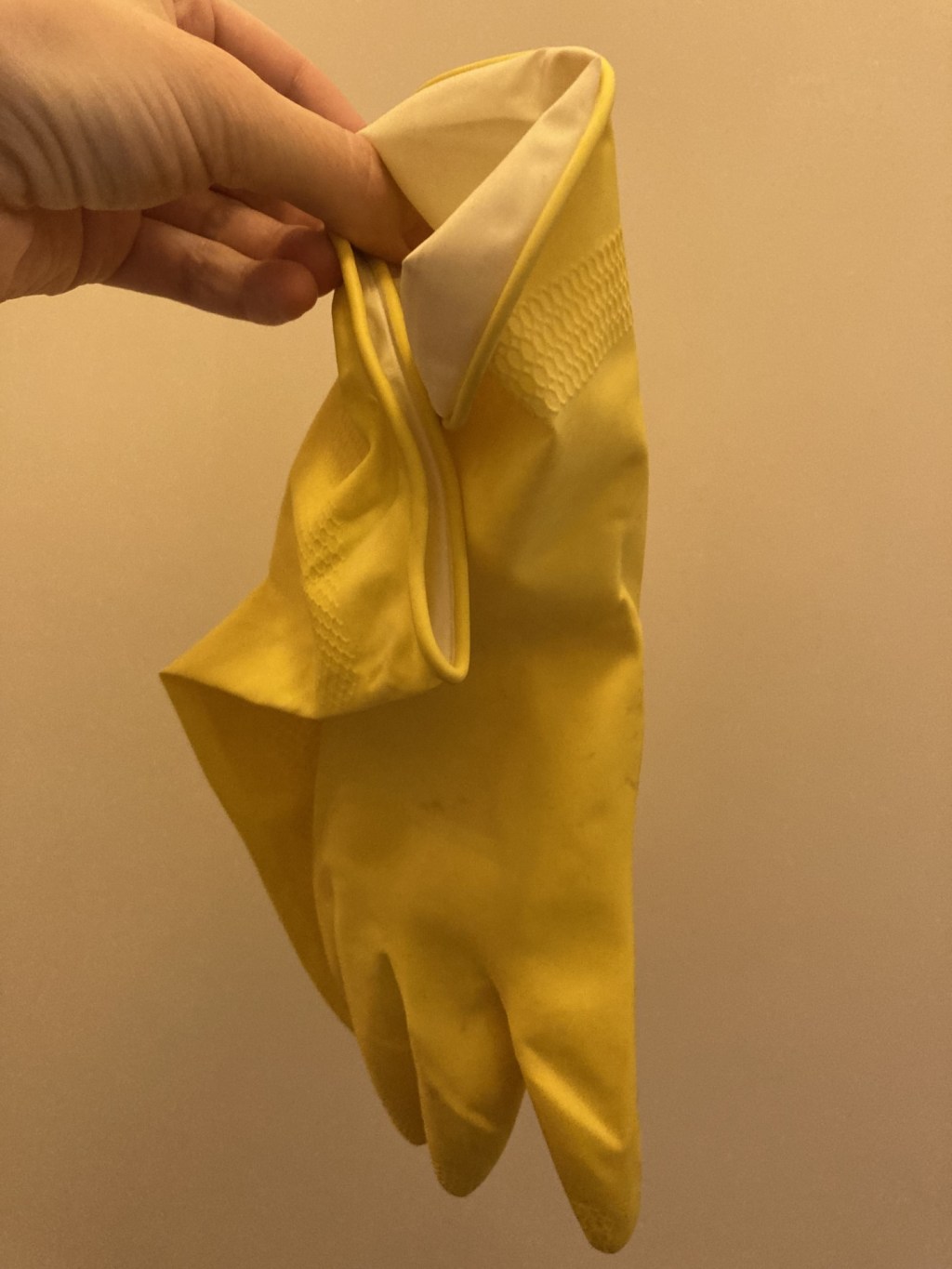 Ik denk na, dit kan niet met blote handen, dus ik grijp de gele schoonmaakhandschoenen uit het keukenkastje. Guusje staat al met haar laarzen aan klaar om naar buiten te gaan. ‘Mam, snel!’ zegt ze.