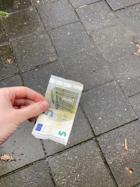 Ik rijk met mijn hand zijn kant op met het briefje van 5 en zijn hand pakt deze voorzichtig aan. Dan verdwijnt hij weer in zijn slaapzak. Ik blijf even vertwijfeld staan. Kan ik meer doen? En wat? Zit hij daar op te wachten?