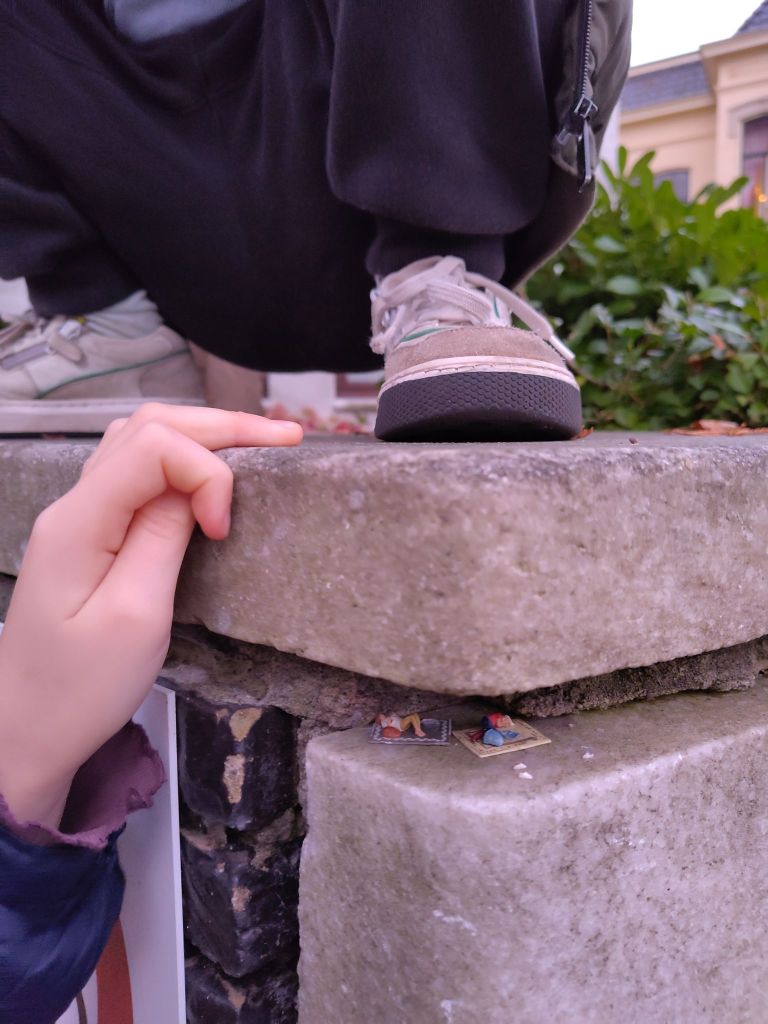 Ik zei tegen Bas: ‘Wat een vriendelijke man was dat.’ ‘Ja, een echte Fries’, zei hij. Sommige poppetjes waren vernield, zo miste er één een hoofd. Maar soms stond er echt iets moois tussen een muurtje. Lotte bekeek het van bovenaf en Guusje op ooghoogte. Het lopen werd