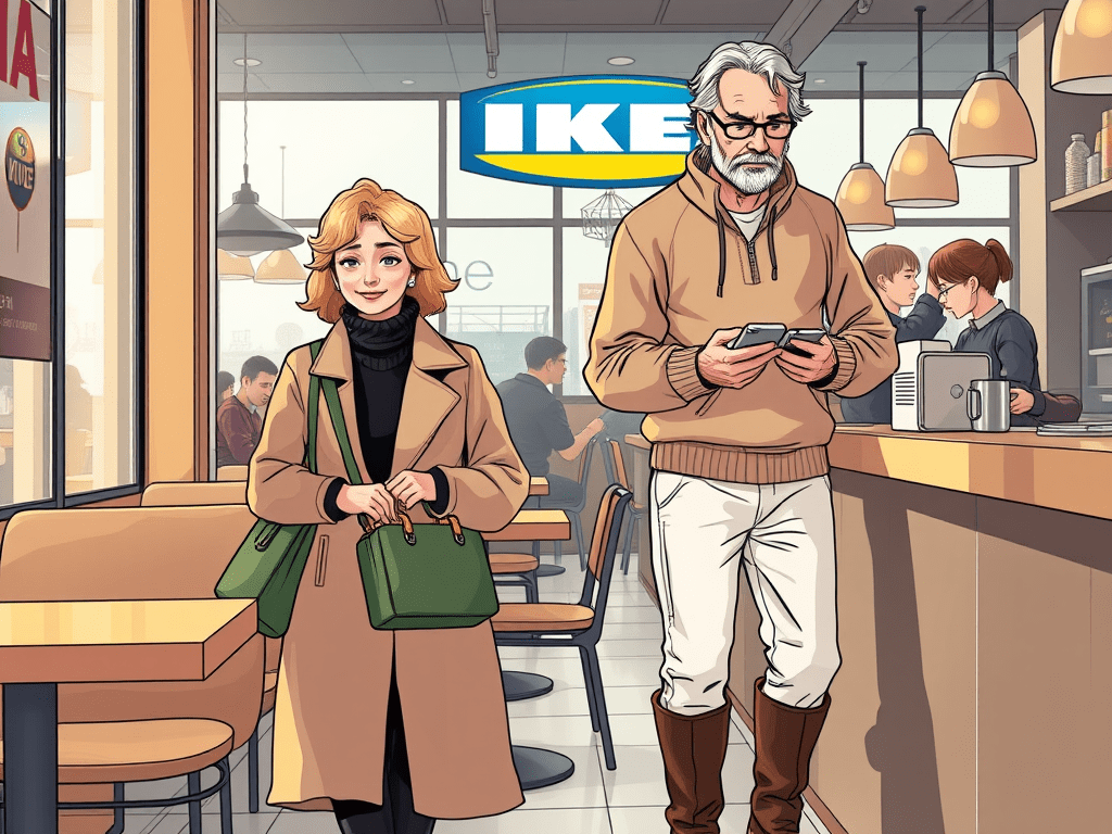We staan bij de IKEA in het restaurant aan de kassa om te betalen. Voor ons staat een echtpaar van 60 plus. De vrouw draagt een zwarte sweater, met daaroverheen een opengeslagen beige lange jas en een groen schoudertasje. De man draagt een beige wollen trui met rits aan de voorkant, witte broek en bruine suède laarsjes. Op zijn neus een klein zwart brilletje.